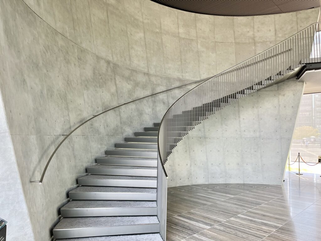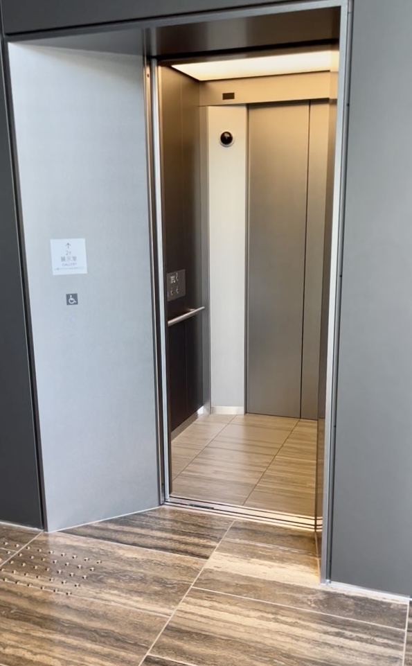 エントランスホールの荘厳なコンクリート壁と階段を横目に、ベビーカー民はエレベーターで展示室へ向かいます。